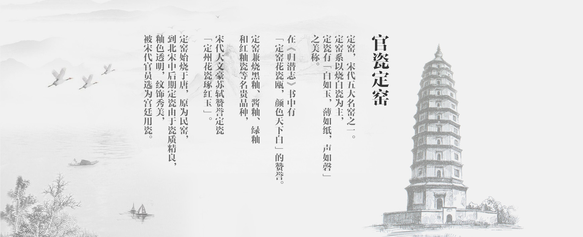 定窯為宋代五大名窯之一,窯址在今河北省曲陽澗滋村、野北村及東西燕村,在宋代屬定州,故名。創(chuàng)燒于唐,極盛于北宋及金,終于元。以產白瓷著稱,兼燒黑釉、醬釉和釉瓷,文獻分別稱其為“黑定”、“紫定”和“綠定”。